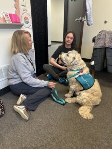New Pet Partners team; Carol Regan and partner Sofie Grace began their visiting career December 1 at a local elementary school. Sofie listened patiently for last minute instructions and then confidently connected with many children through reading. A trip to Starbucks for a post visit treat capped off a fabulous first day.